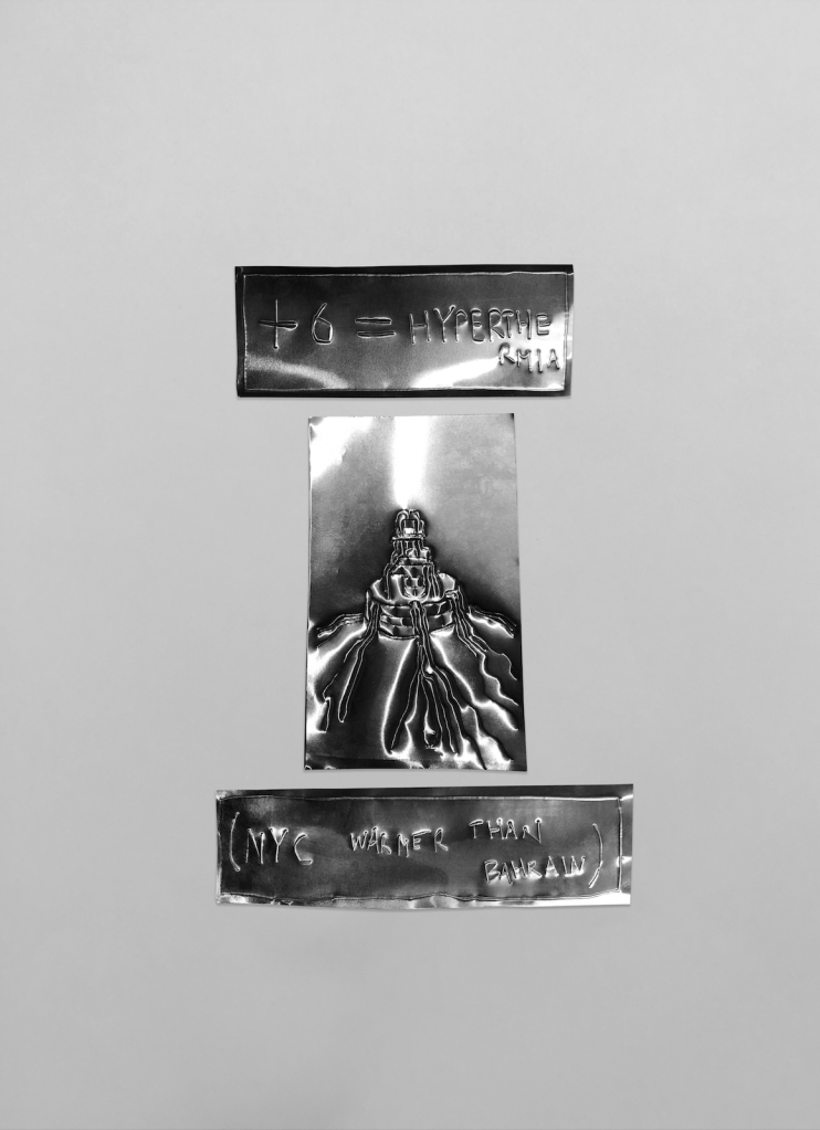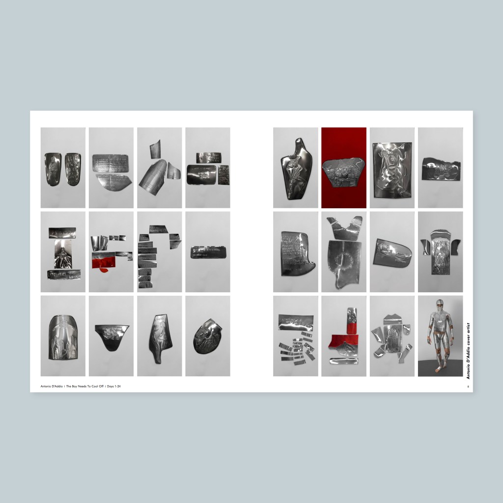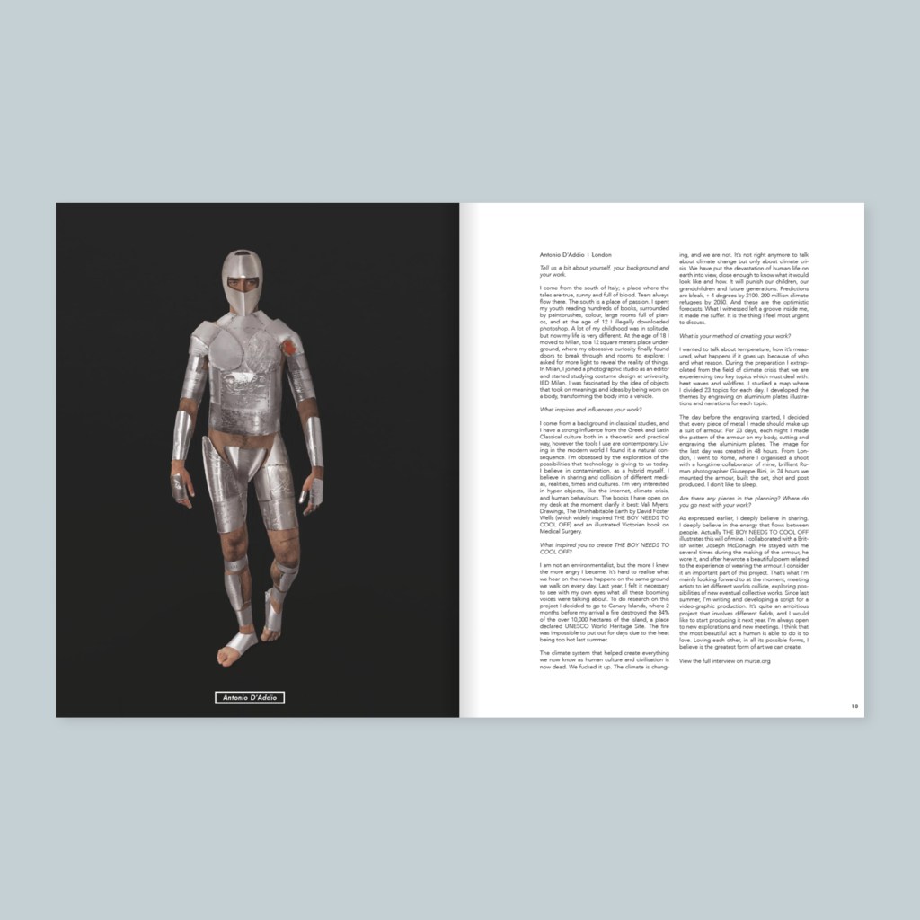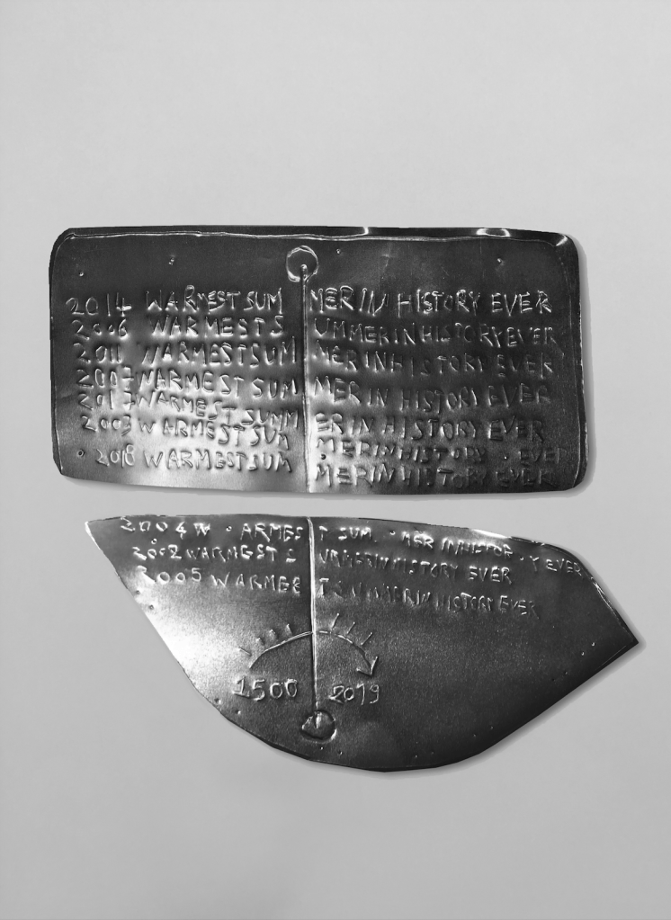 The poems, written in collaboration with the English poet Joseph Issac, respond to the images of devastation engraved on the plates. The creation of the armor is inspired by the image of a man walking through fire, suggesting that the way to escape the normalization of events is to individually cross it. The narrative path starts from the analysis of the physical phenomenon of heat waves and spontaneous fires, arriving at the analysis of the concept of climate refugee: the fate that scientists predict for half of the world’s population by 2100.