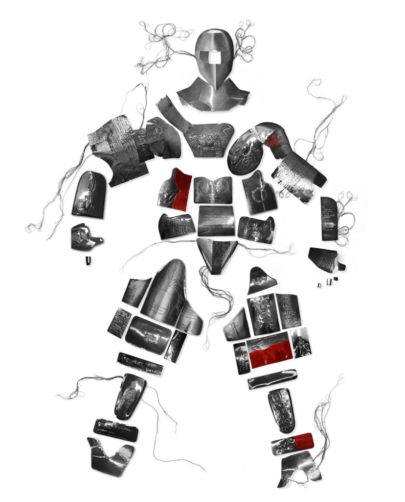 The piece is composed by 78 metal plates engraved with images and words that make up an armour.